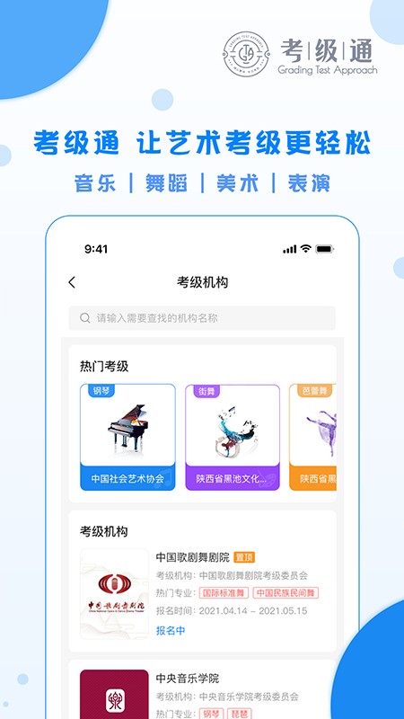 考级通融合全品类考级服务,满足用户考级需求。覆盖舞蹈音乐曲艺美术等多类艺术项目,选好大方向就能细分找到对应专业与具体乐器方向。能在线录制提交相关作品,过往练习与待评的考级作品都可随时翻看查阅,还能梳理出周边线下相关考点,方便就近报名参与考前培训。面向整个艺术考级相关链条给出定向方案,帮行业理顺流程压缩成本,也让适龄学员随时可以参与考核。