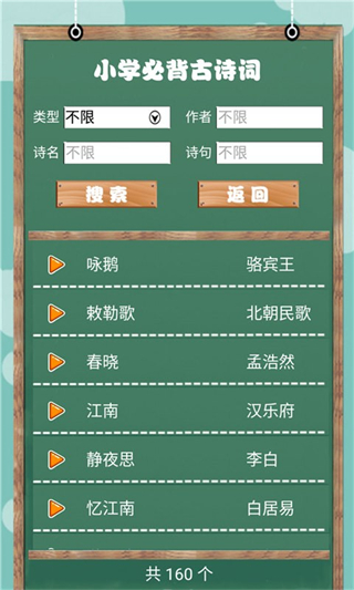 小学必背古诗词朗诵是专为小学生量身打造的古诗词学习应用,紧扣小学语文教材大纲,一到六年级全部必背篇目,覆盖课内考点与课外拓展内容。提供专业朗诵示范、标准拼音标注、逐句释义、作者背景、图文赏析,帮助孩子轻松理解诗意、规范发音。支持跟读对比、循环播放、离线收听、定时朗诵,随时磨耳朵、练语感。简洁护眼、操作简单,无广告干扰,适合孩子自主使用。
