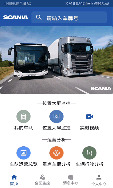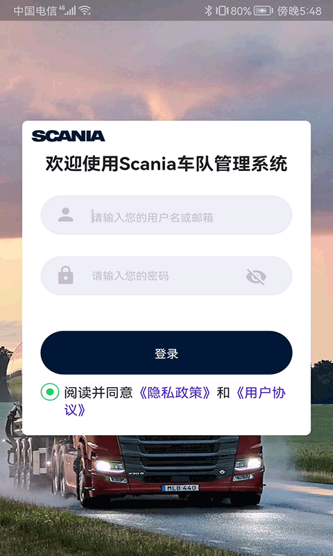 1、在【Scania车队管理系统】登录页,确认已填入账号及对应密码,点击【登录】按钮,提交账号信息以进入车队管理系统。