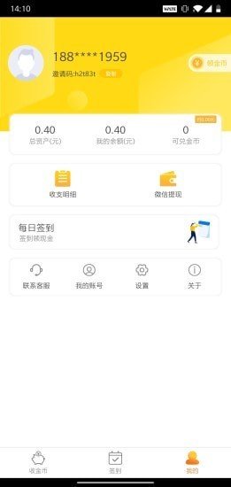 1、在赚金币类应用的收金币页面,点击底部“我的”选项,可进入个人中心界面,查看账号相关功能。