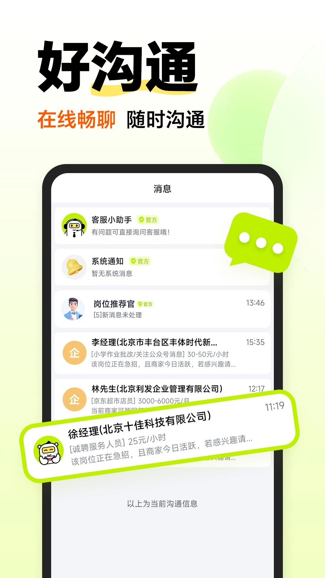 1、开启消息实时提醒,用工对接信息及时传达拉近求职者与商家沟通距离。