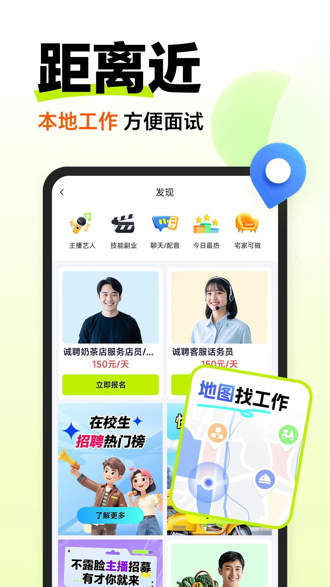 4、支持自由灵活上岗,无固定地点限制搭配极速入职板块实现当日上岗。